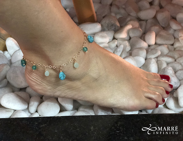 A turquesa é uma cor que exala alegria e muita simpatia, seus looks vão ficar perfeitos com um toque bem especial no tornozelo, valorizando saias e vestidos sejam eles curtos ou longos.
