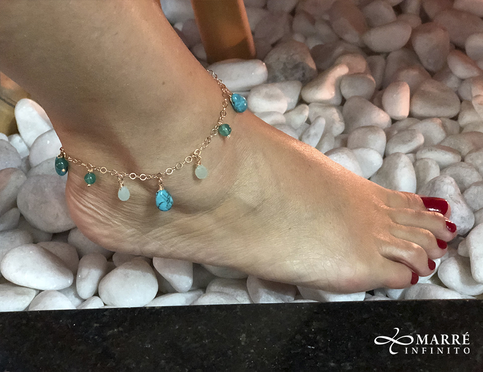 A turquesa é uma cor que exala alegria e muita simpatia, seus looks vão ficar perfeitos com um toque bem especial no tornozelo, valorizando saias e vestidos sejam eles curtos ou longos.