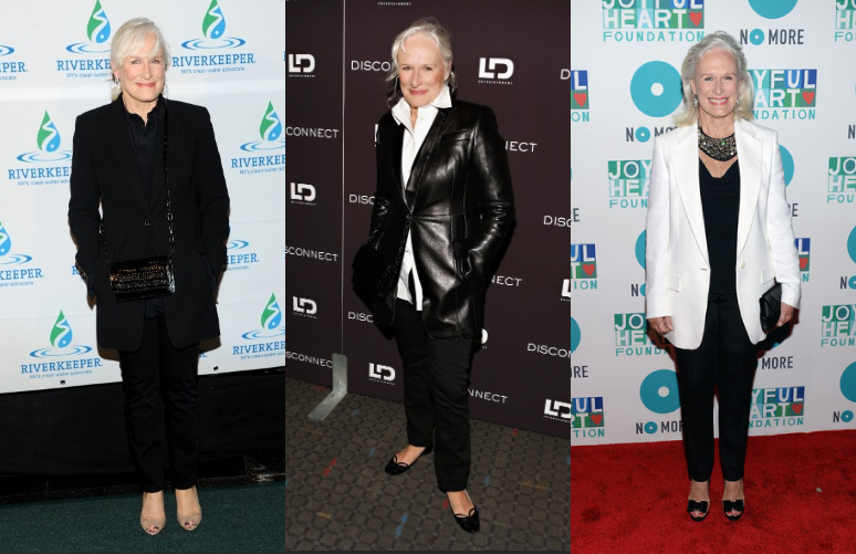 O visual de Glenn Close é marcado com looks preto e branco. Desde vestidos para o tapete vermelho a conjuntinhos interessantes, esta combinação de cores chama a atenção. Para não deixar o visual monótono, porém, brinca com diferentes cortes e peças, variando formas.