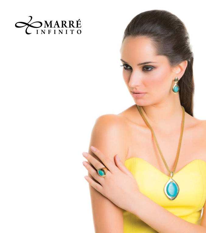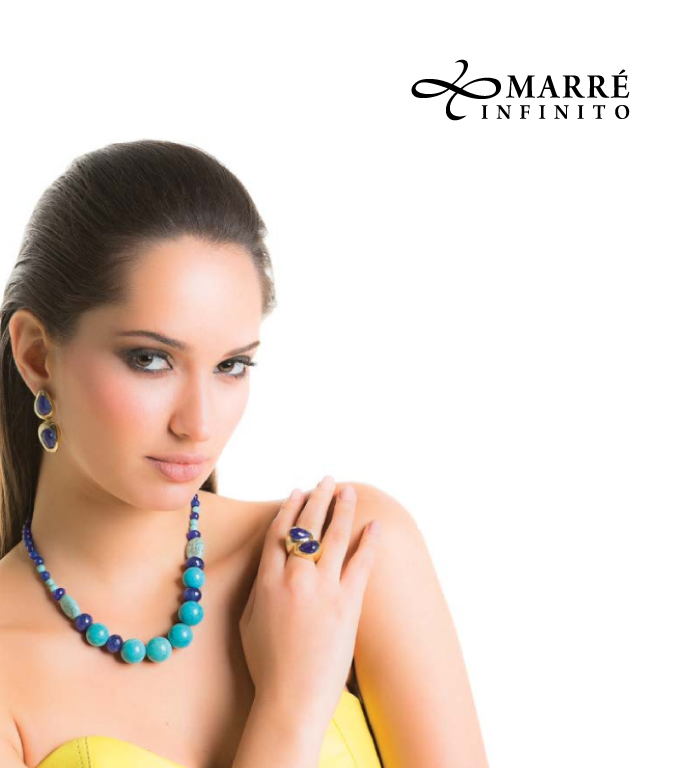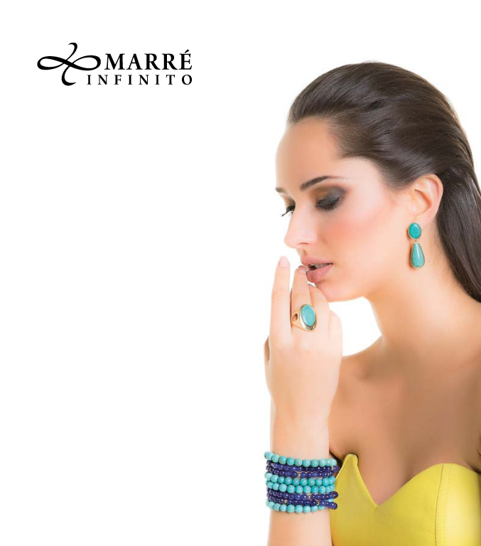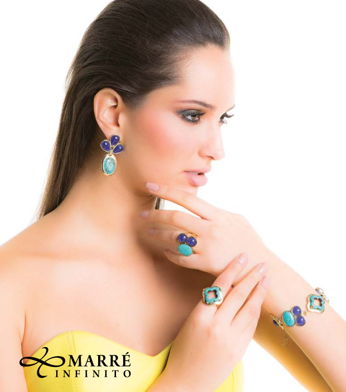 O tom azul aparece nas pedras turquesa e jade cobalto, além dos cristais Swarovski no tom Bermuda Blue. O branco é a jade branca em seu tom natural. Já o amarelo aparece no ouro, que banha todas as peças da coleção – grande riqueza da nossa nação e de Minas Gerais, casa da Marré Infinito.