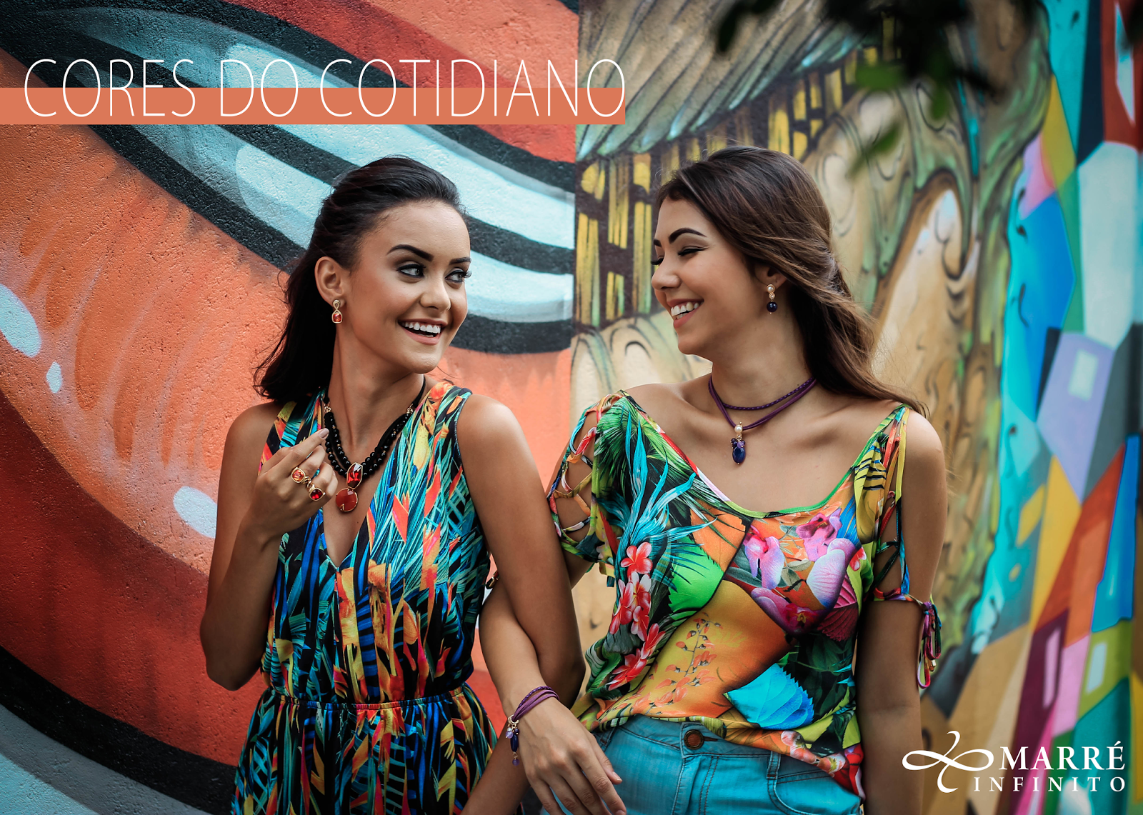 A arte de rua de cores intensas, dão ainda mais vida as estampas das roupas das amigas. As joias da Marré Infinito dão relevância a algumas cores. Chris veste conjunto em couro, ametistas e quartzo rosa. Tainá veste conjunto em ágata negra, jade laranja e cristal SWAROVSKI nas cores Red Magma, Siam e Astral Pink. Diga que não é contagiante a cena de ver as duas amigas conversando descontraidamente.