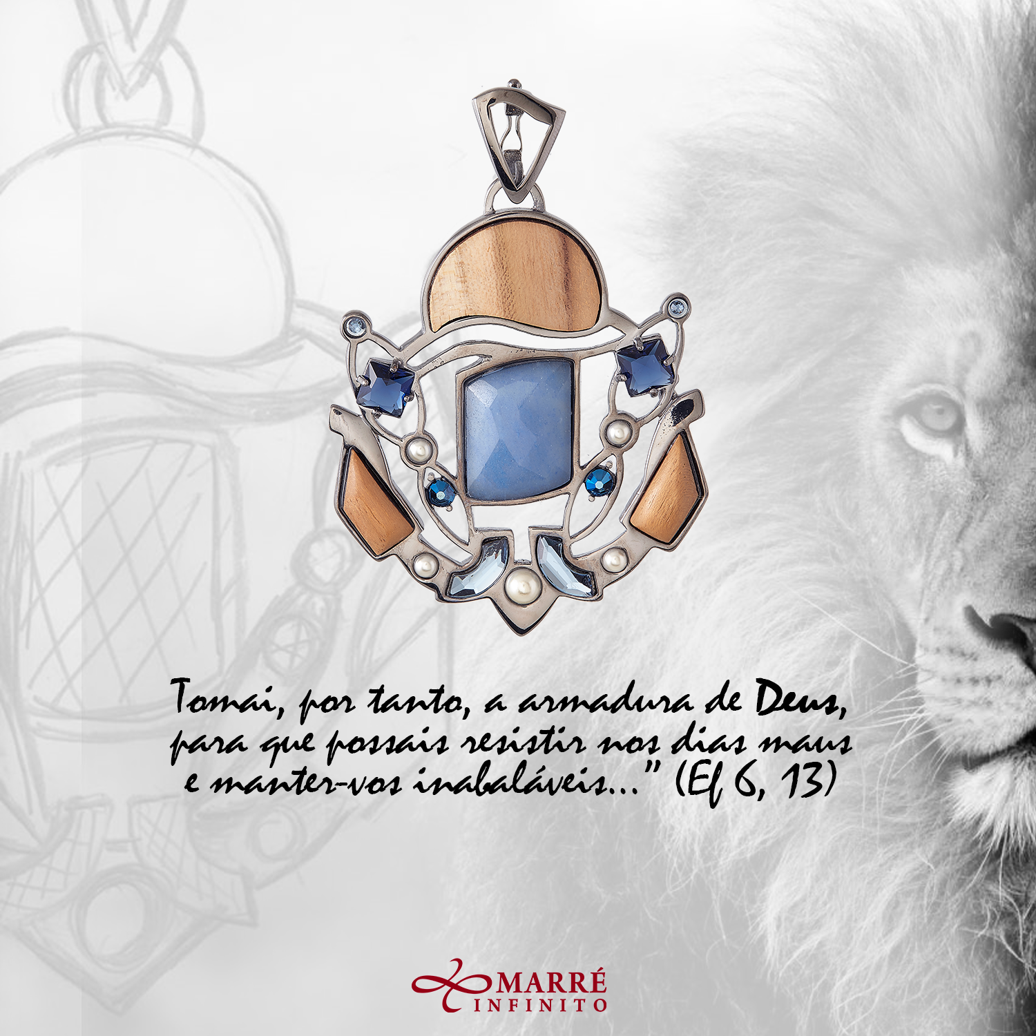 Para representar a Armadura de Deus, um mix de gemas incríveis, o “Capacete da Salvação” e as “Sandálias do Evangelho da Paz” em madeira teca, o “Escudo da Fé” em quartzo azul, a “Espada do Espírito” em SWAROVSKI, cristal facetado e pérolas e o “Cinturão da Verdade” em pérolas e cristal SWAROVSKI. A “Couraça da Justiça” se esconde em meio as demais partes da forte armadura.