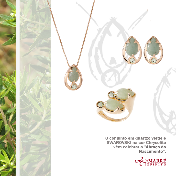 O conjunto em quartzo verde e SWAROVSKI na cor Chrysolite vêm celebrar o “Abraço do Nascimento”.