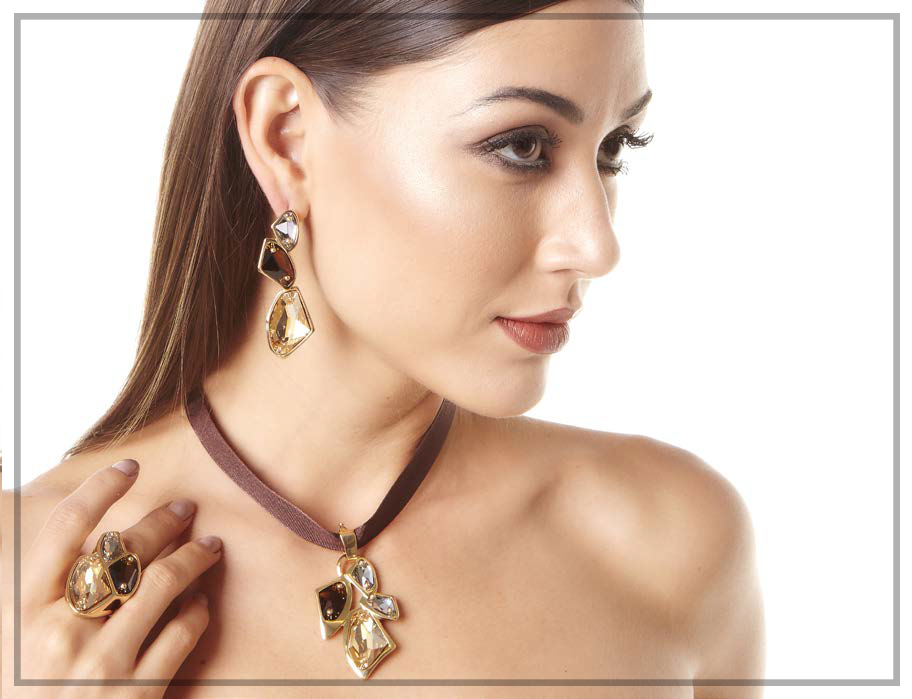 O Conjunto Ostentação não poderia deixar de marcar sua presença na Coleção Para Sempre Marré. Um dos Ícones mais cobiçados, ele valoriza o cristal SWAROVSKI na cor Mocca com o tom de marrom da fita de gorgorão, que chegadinha no pescoço valoriza a silhueta e dá espaço a cada peça deste conjunto magnífico.