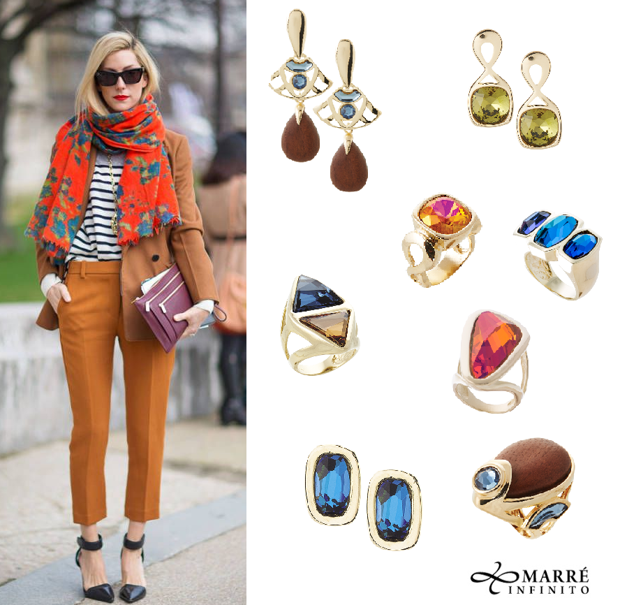 Se a echarpe for colorida, escolha uma semi joia com um dos tons do tecido. Caso ela seja monocromática, você pode brincar usando uma peça mais clara ou mais escura, gerando um tom sur tom, ou usar algo que contraste e chame a atenção. Para arrematar o look aposte em anéis exuberantes e com um design especial. Eles têm personalidade e não precisam combinar com os brincos.