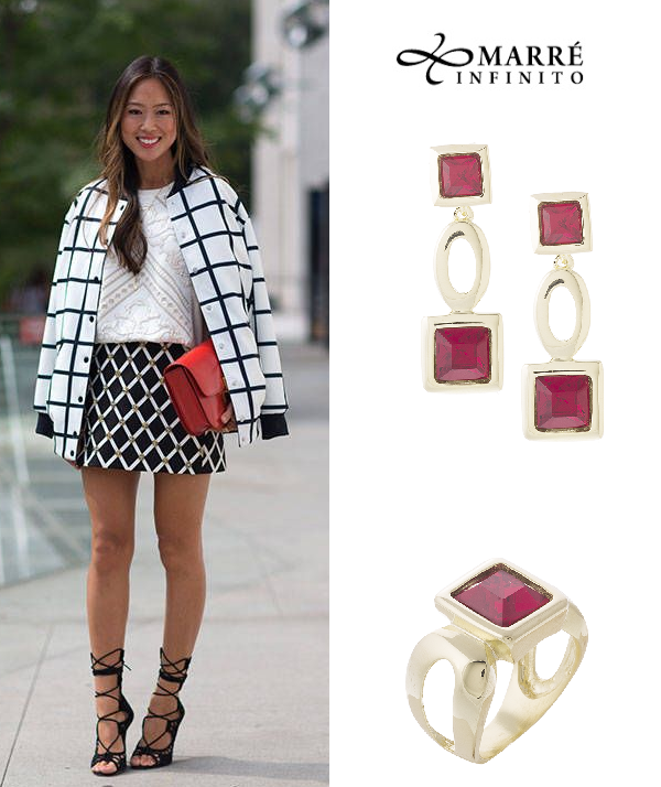 Um bom exemplo é esse look, que une um casaco com animal print e uma blusa geométrica, que tem em comum as mesmas cores. Para realçar o efeito, jogamos uma calça amarela e joias neutras, com gemas que conversam com as duas propostas. O look ganhou força e ficou bem moderno.