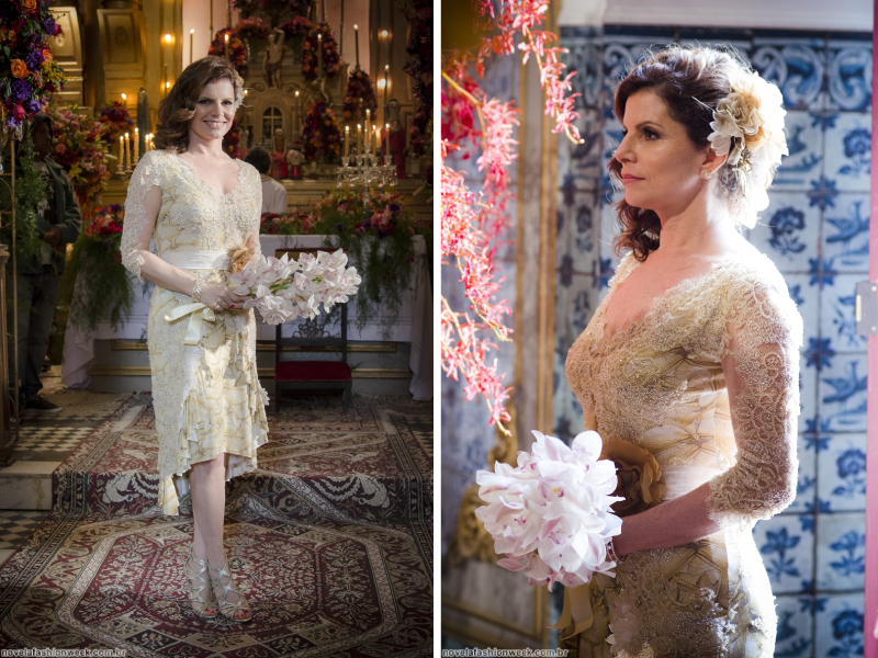 Risoleta, personagem de Debora Bloch, casou-se abençoada na igreja. O vestido da noiva combinou com seu estilo, com corte marcado. Isto é, o vestido não possui volume (sendo rente ao corpo), há uma abertura discreta nas costas e meia manga. Não deixa, claro, de ser bem romântico: é todo bordado com renda, e, na cintura, é possível notar flores aplicadas e uma faixa de cetim.