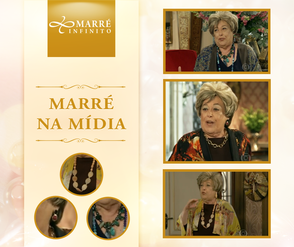 Destaque na novela “Alto Astral” da Rede Globo, a personagem Marieta, interpretada pela maravilhosa atriz Marilu Bueno usou peças da Marré Infinito em alguns episódios: