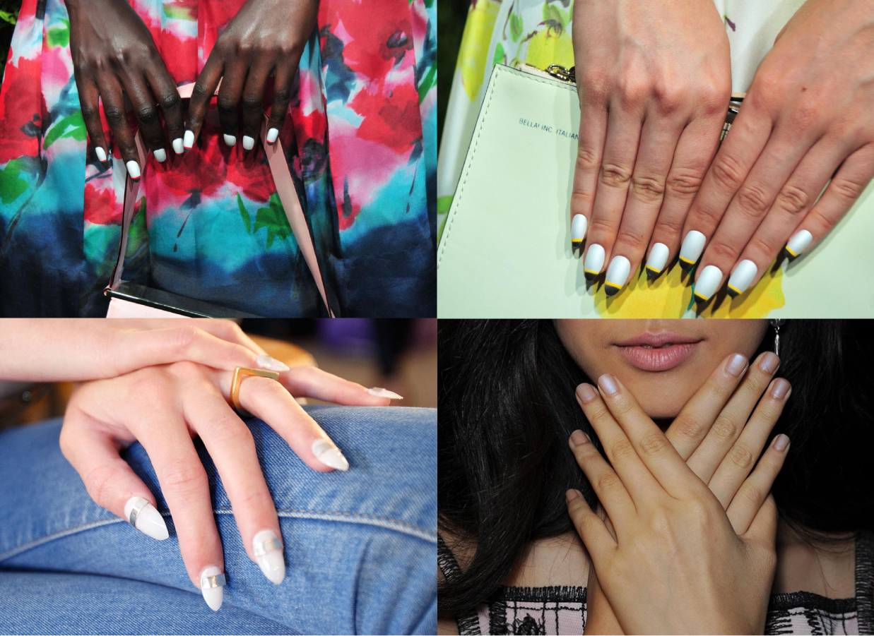 Confirmando a tendência apontada pelos fashionistas, as unhas agora são básicas. São pintadas de nude, branco – no máximo, tons lavados de cores. Ou então aparecem apenas com uma base incolor.