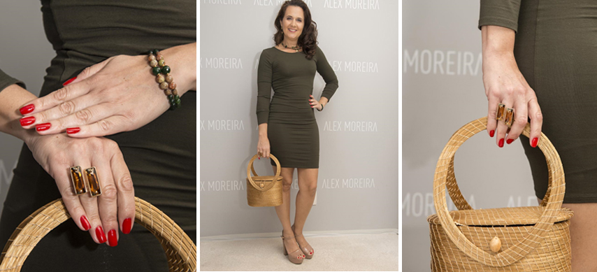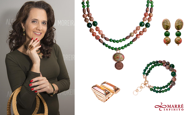 No look escolhi um mix de peças de unakite com madeira e jade malásia para colar e pulseira, e o anel em cristal SWAROVSKI, um dos best sellers da Marré Infinito presente em todas as edições do Catálogo de Ícones.