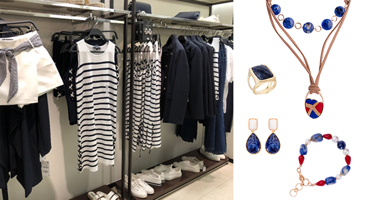 O estilo Navy veio com uma elegância atualizada sem igual. A saia em listras vermelhas e branca, da Riachuelo da Oscar Freire, abandonaram o tradicional listrado horizontal e com as listras aplicadas na diagonal em três variações propõem um composê perfeito e dão um toque de inquietude com uma nova estética.